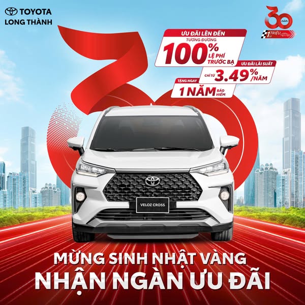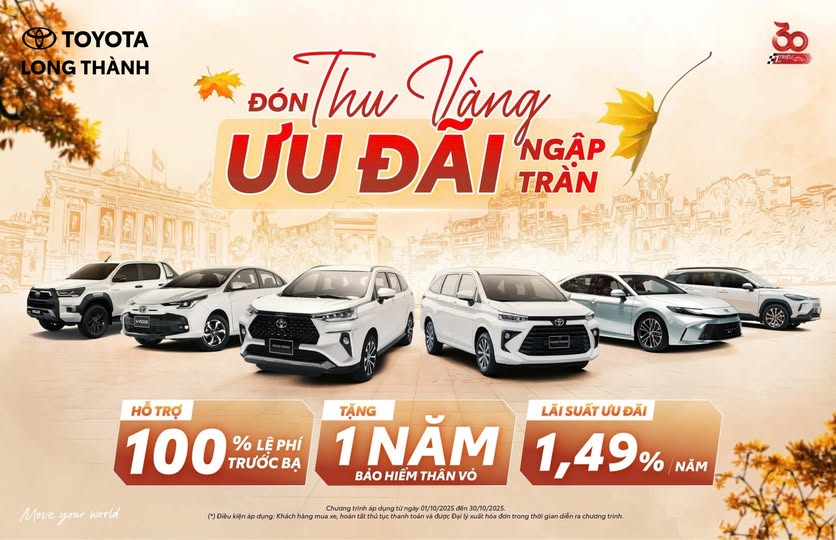Kỷ niệm 3 thập kỷ có mặt tại thị trường Việt Nam, Toyota hân hạnh đồng hành trên hàng triệu cung đường, ghi dấu trong những phút giây sum vầy và hạnh phúc của khách hàng. Tri ân hành trình 30 năm, Toyota Việt Nam mang đến ưu đãi hấp dẫn trong tháng 9 này dành cho những mẫu xe được các khách hàng yêu thích: